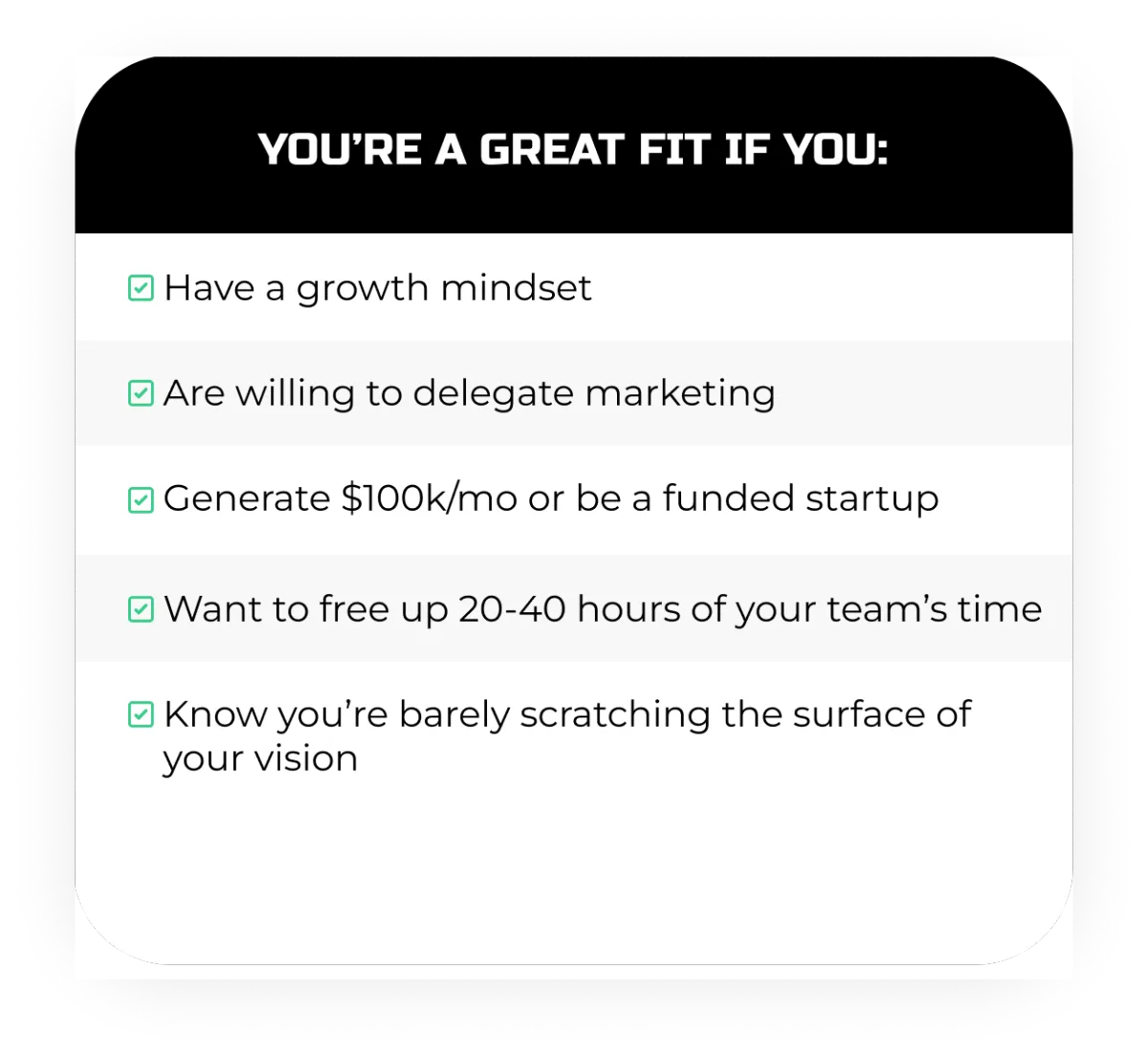 Founders, entrepreneurs and brands hovering around the $100,000-$250,000 /mo revenue who want a scalable marketing machine. We work with business owners who understand marketing is a freedom-generating asset that pays for itself as you grow, scale or eventually exit your business.